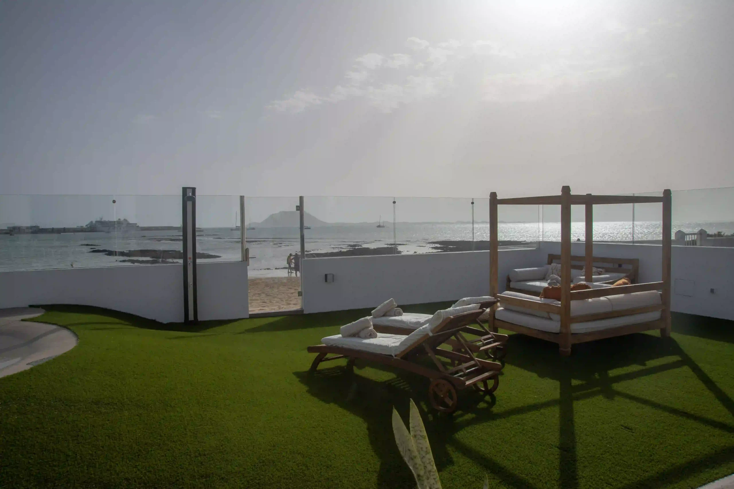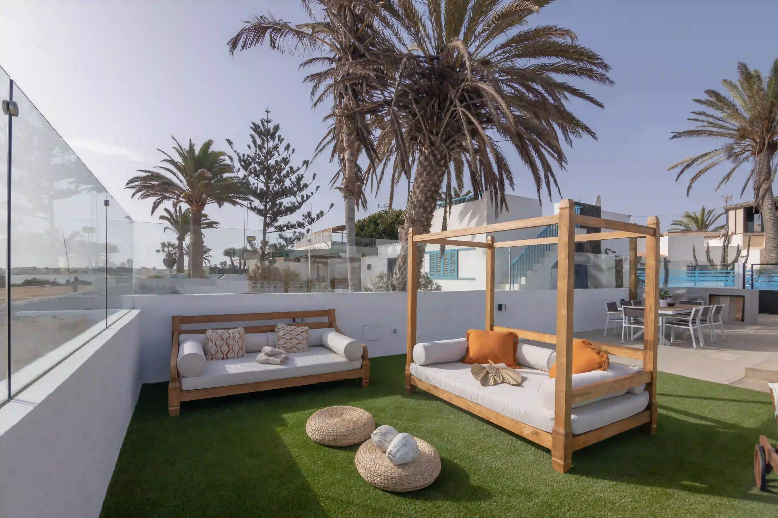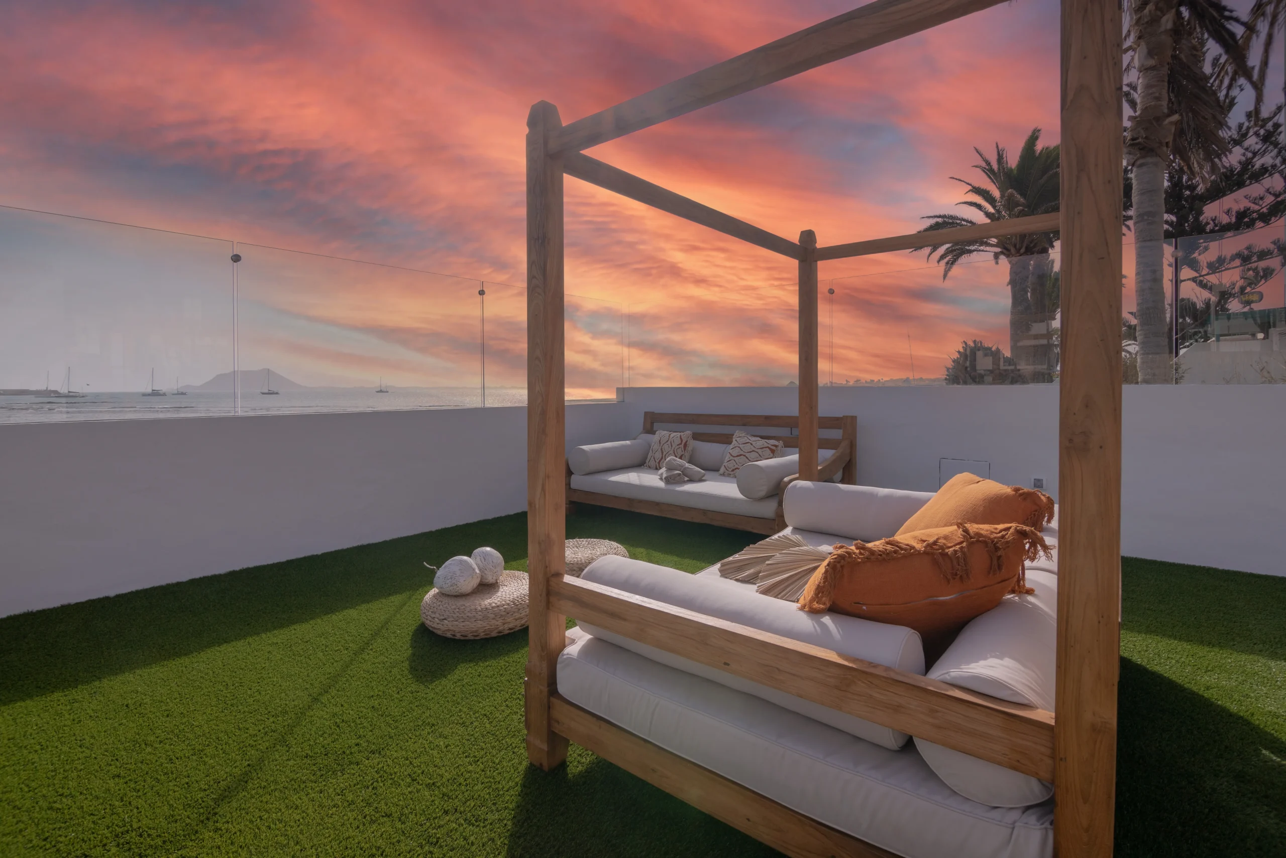 Situata nel cuore della vivace Corralejo, questa esclusiva villa fronte mare offre un’esperienza unica per un massimo di 6 persone. Su un terreno di 470 m², Villa Edén dispone di un’area esterna privata con parcheggio e punto di ricarica per auto elettriche, zona pranzo all’aperto accanto al barbecue, lavandino, frigorifero, bar tiki e un letto balinese perfetto per rilassarsi. Il gioiello dell’esterno è la piscina in pietra naturale con acqua salata, che conserva il calore del sole ed è situata proprio accanto all’accesso diretto alla spiaggia.