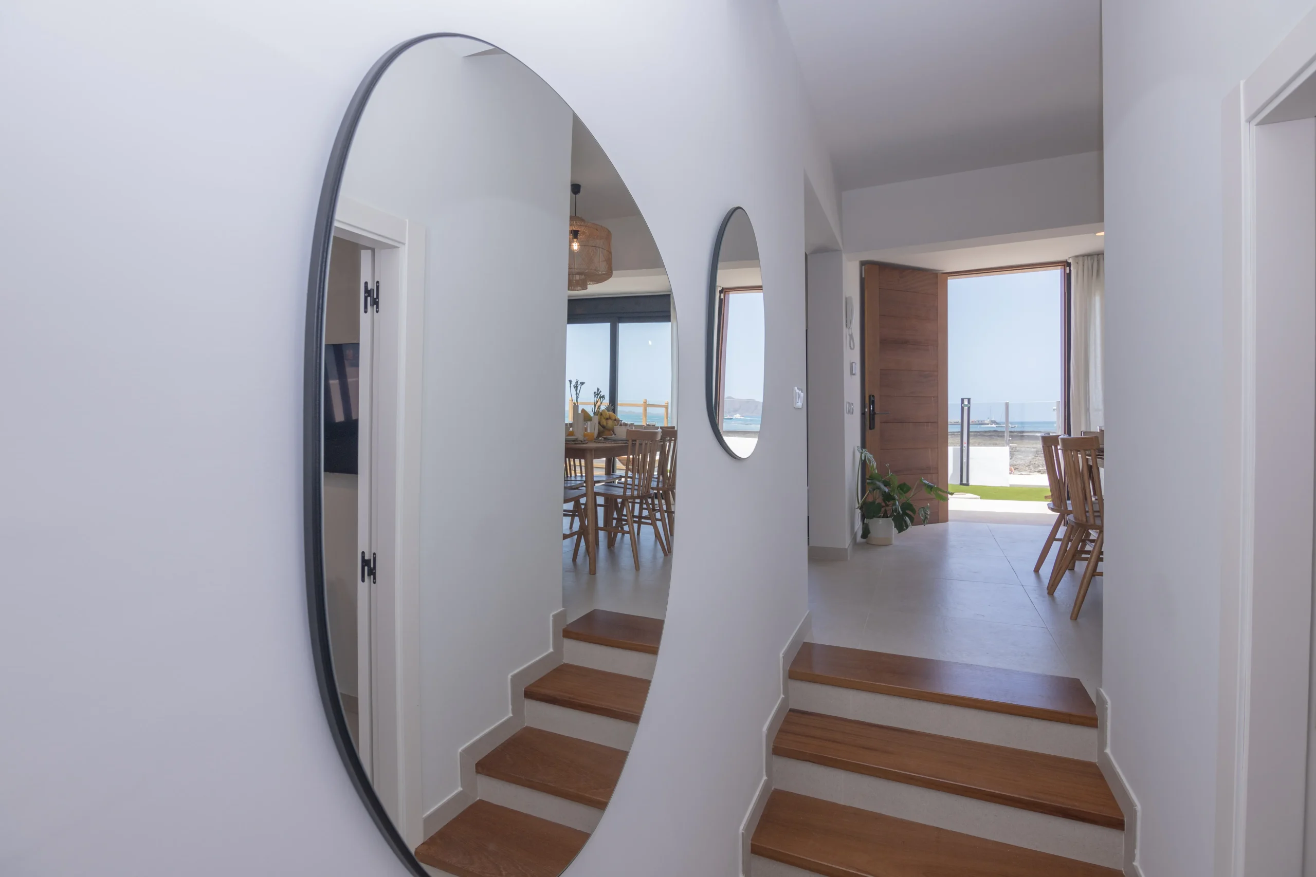 L’accesso alla casa avviene tramite pochi gradini. All’ingresso vi accoglie un ampio soggiorno-pranzo con aria condizionata e TV, che si apre su una cucina moderna con isola e una spettacolare vista sul mare. Cucinare qui diventa un vero piacere. Dalla cucina, grandi porte conducono a un portico ideale per gustare il primo caffè del mattino con vista su Lobos e Lanzarote.
